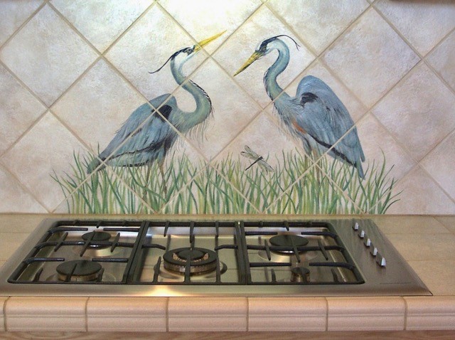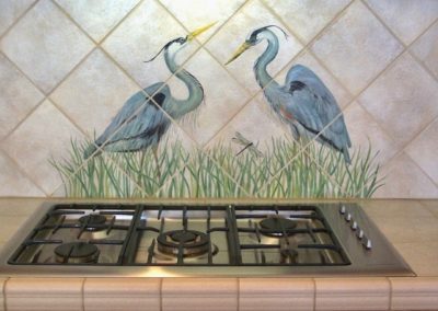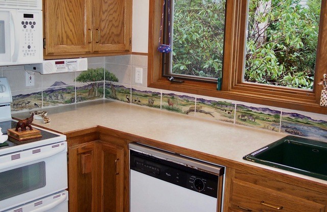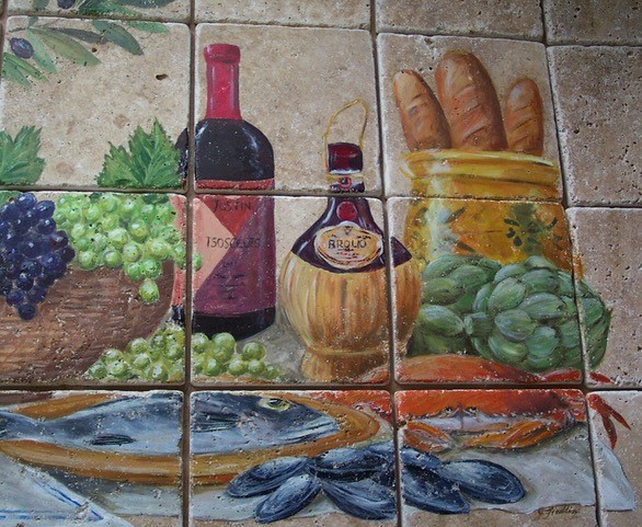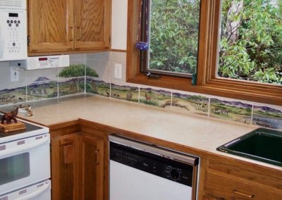 Custom means custom–Julie loves collaborating with clients to create tile murals that achieve the effects they want. This artful, one-of-a-kind mural brings a whimsical team of chefs and pigs right into the client’s kitchen–it replicates her kitchen layout, curtain material, copper pan collection and even her Wheaten Terrier. Communicating with you by phone and email, Julie explains and shows you the process, making you a co-creator in the work you will enjoy for years.